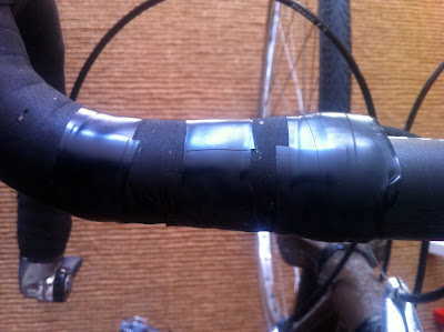 In it, the guy says it's OK to ride a bike in your underpants, so I decided that's what I was going to do. (Though I also had clothes on over my underpants, because I'm just self-conscious that way.) Then, for the first time since returning from Italy and the puzzlingly-named Full Bike Day, I removed my detachable travel chariot from its case and reassembled it. I'm pleased to report that even after being molested by baggage handlers in four countries (I'm referring to the bike bag, and not me, though I suppose if I'd been molested by baggage handlers in four countries I'd have a potentially lucrative lawsuit on my hands) it was still in good shape. The only maintenance I needed to perform was taping the bars--though when I say "tape the bars" I obviously mean this: